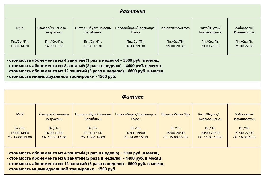 Вы можете выбрать одну тренировку в неделю, два любых удобных вам дня в неделю или работать по полному расписанию. Вы можете тренироваться индивидуально в удобное вам время по договоренности с тренером.